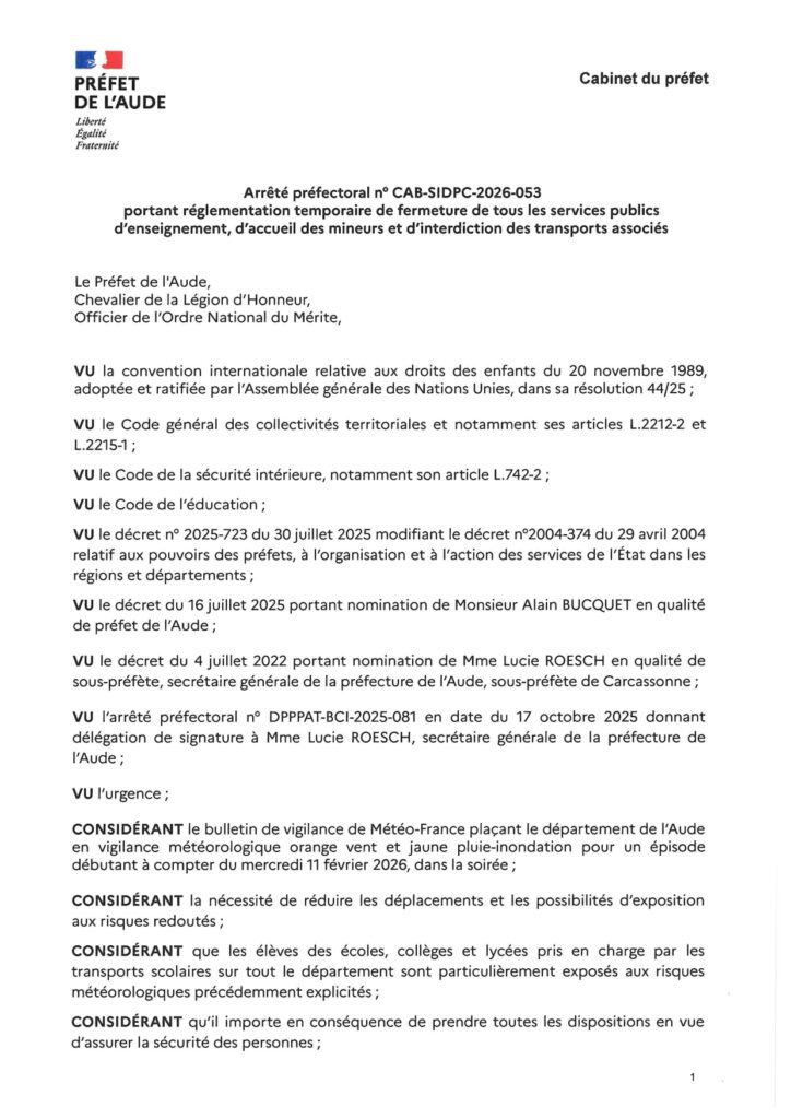Par arrêté préfectoral CAB-SIDPC-2026-053, la Préfecture de l’Aude annonce la fermeture, sur l’ensemble du département de l’Aude, des crêches, écoles maternelles, écoles primaires, collèges, lycées et établissements d’enseignements supérieurs et agricoles pour la journée du Jeudi 12 Février 2026.